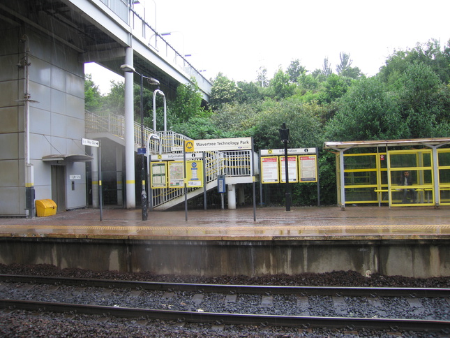 One stop down the line from one of the oldest station sites on Merseyrail, Broad Green Wavertree Technology Park is a new station, built in 2000. We visited in the pouring rain, and it was a bit of a struggle to keep the camera dry! The best view of the station is from the road which crosses the line to the east of the station. Looking here west at the station building which sits on the footbridge crossing the line: