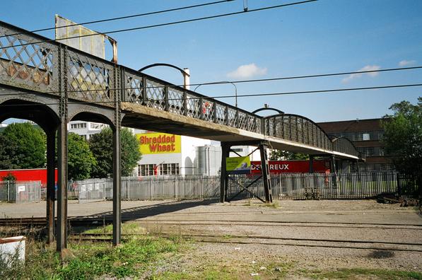 From the other side, a long footbridge provides access to the station over some goods lines: