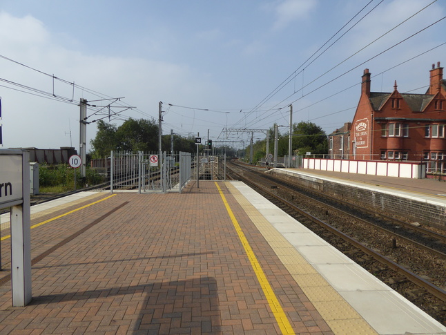 Looking east along platform 5. In the distance on the left the line curves away towards Ince: