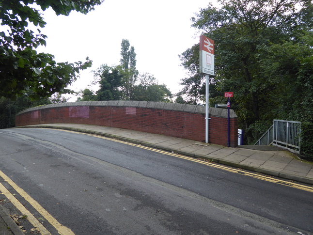 Woodsmoor is a relatively new (1990) station, sitting in a woody suburb of Stockport. There are entrances to both platforms from the road bridge that crosses the line, here with the platform 1 entrance visible: