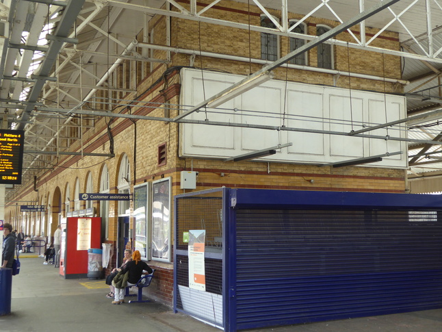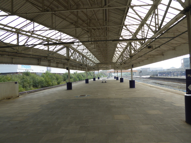 Looking south along platform 1, where there's a curious mixture of old iron columns and modern glass-and-steel waiting rooms: