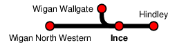 Ince, to the east of Wigan, has a small quiet station, which was deserted when we visited. It's just a single island platform with two faces, accessed from a road bridge over the line. The entrance to the station, on Ince Green Lane: