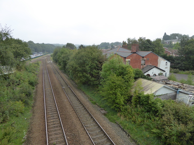 Up on the bridge over the line, looking east at the station, with the diverging junction visible in the distance: