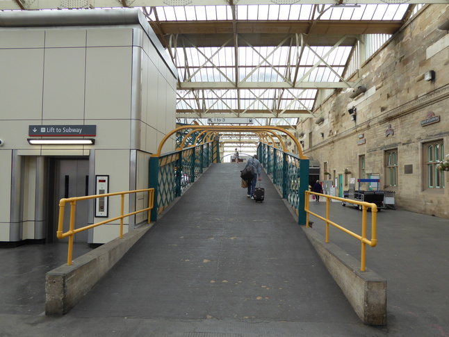 Steps and a ramp lead up to the footbridge, and a lift down to a subway: