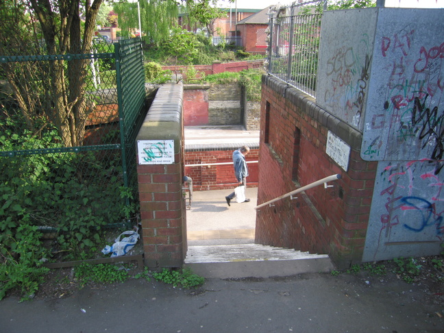Steps down just to the left of the previous photograph. The sign on the left tells of a closed footbridge, of which there are still traces: