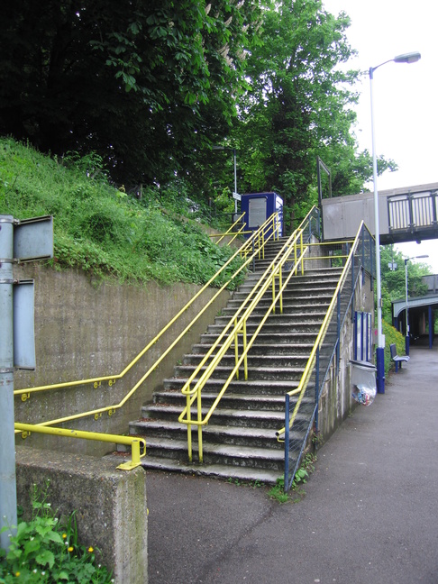 The approach path leads past a small ticket kiosk and the footbridge to platform 2 down these steps: