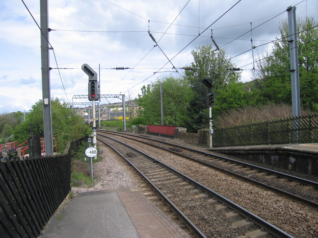 Looking east along the line from the end of platform 1, with the entrance steps visible on the left: