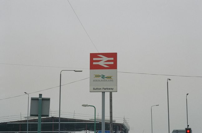 Sutton Parkway is a station on the Robin Hood Line, a platform in the middle of nowhere serving a carpark, presumably to act as a Park and Ride service. Looking down at the line and platforms, with the railings all painted in the line's trademark green and yellow: