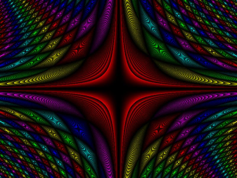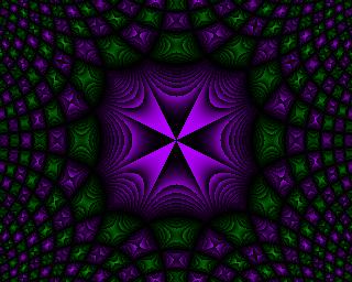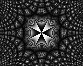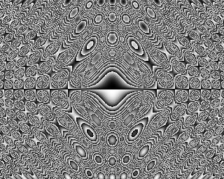 Unfortunately, the pattern proved to be elusive. The way it was generated provided an obvious way of magnifying it: the program was computing a function at every point of a square grid, so to enlarge it you just compute the same function at some new points in between the original points, right? Wrong - if you try that, a lot of the interesting detail in the butterfly shapes just disappears. Some of it remains, but more and more of the detail disappears the further you enlarge the image. It was like trying to nail fog to the wall - at 320x256 resolution, the image obediently sat there and looked pretty, but as soon as I looked any closer it vanished. Infuriating.