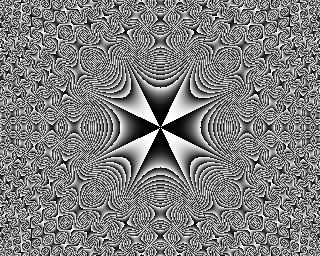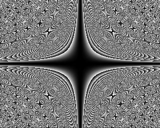 Now that's much more interesting than interlocking circles, isn't it? It's got clear structure at the centre - black fades to white and jumps back to black again, repeatedly, in narrower and narrower stripes. Then, once the stripes become smaller than the distance between pixels, the delicate filigree (hence the name) degenerates into chaos. But beyond that, as if by magic, the chaos reforms into a new order, with little butterfly shapes embedded in the swirling black and white maelstrom. I stared at this feast of interlocking detail and was very glad I'd typed the circles formula in wrong. Then I set about enlarging it to poster size, so I could print it out and put it on my wall.