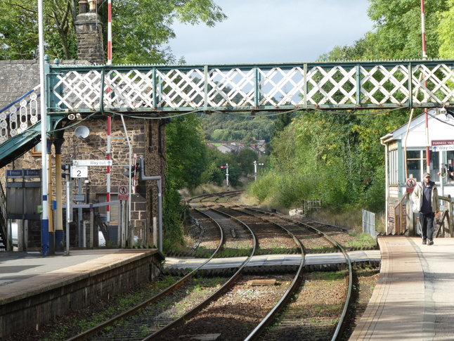 With a bit of hefty zoom, a view of the footbridge and level crossing from platform 1: