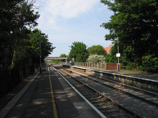 The view along platform 2 towards the footbridge, with platform 1 on the right: