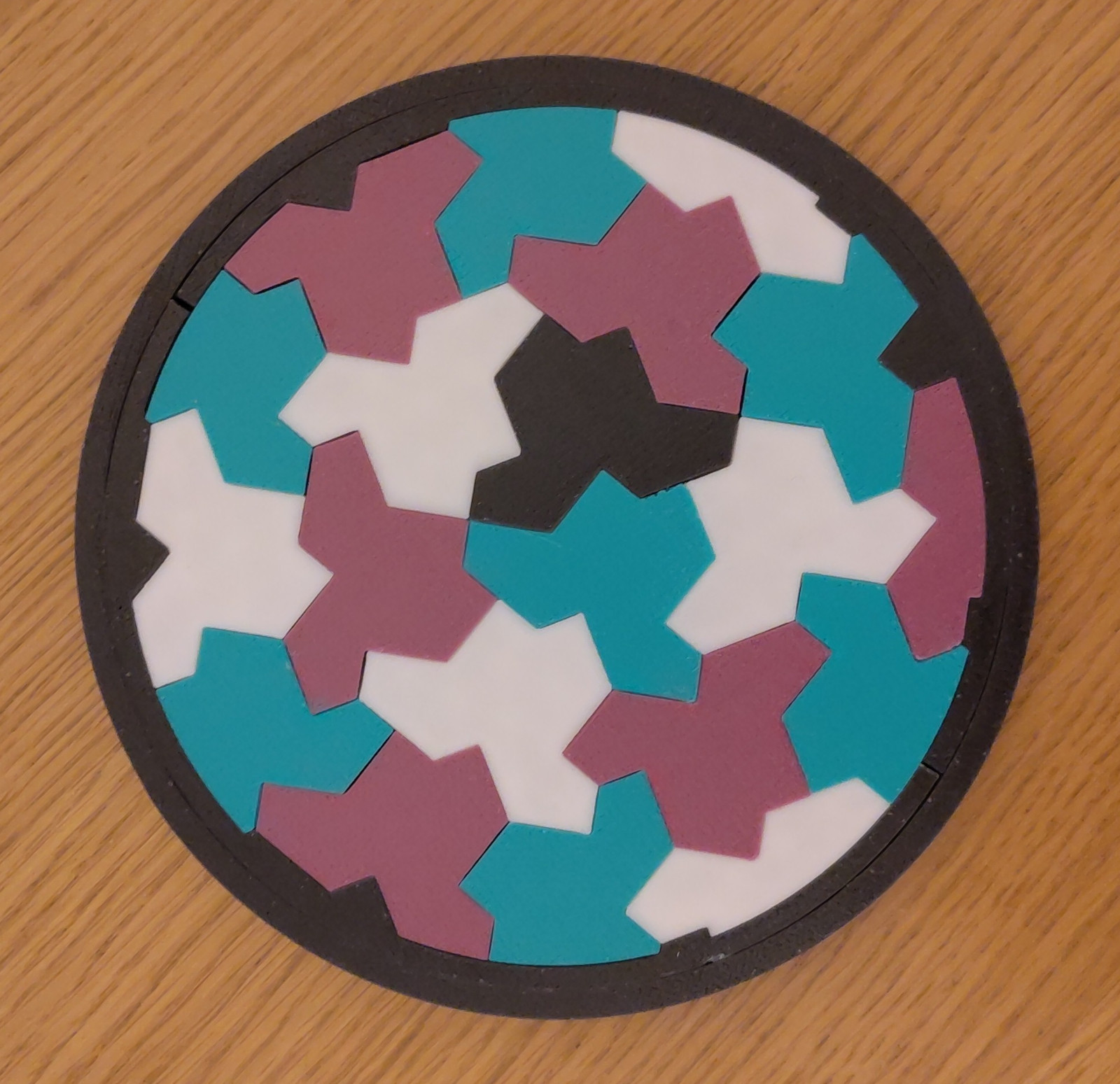 red.stl: first colour of hat tileyellow.stl: second colour of hat tilegreen.stl: third colour of hat tileblue.stl: fourth colour, used for the single reflected hat/turtle tile in the puzzle, and also for the inner two-part circular frameframe.stl: an outer circular frame in one piece, to hold the whole puzzle together once it's made.(Of course, you don't have to pay any attention to the colours suggested in the file names. As you can see, even my own copy didn't. They're completely arbitrary. Up to you what colours you print it in!)