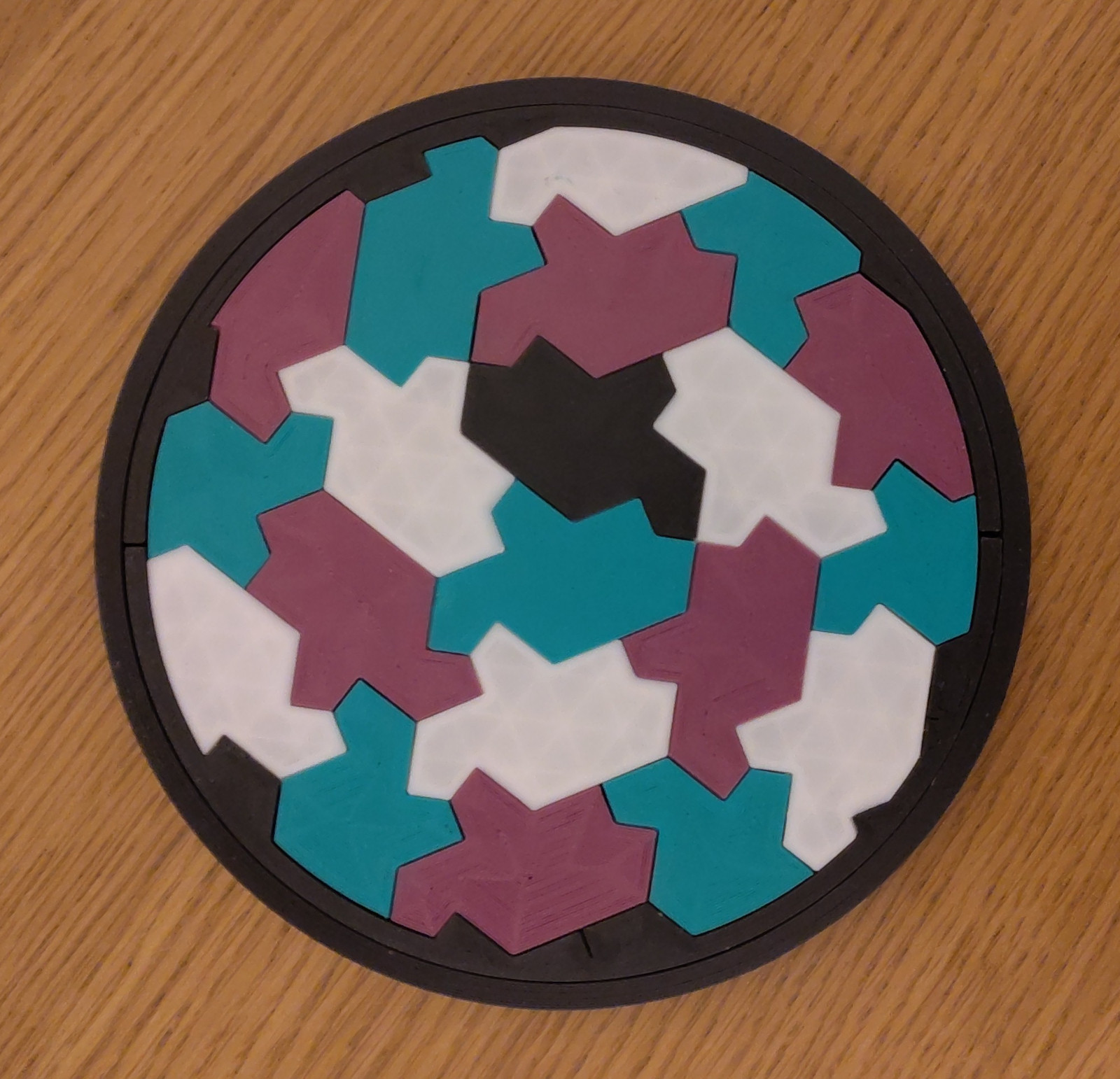 The tiles are distributed between four STL files, intended to be printed in different colours. This gives the finished puzzle a proper four-colouring (no two adjacent tiles are the same colour), which makes it a bit easier. But you could print it all in the same colour if you prefer it to be harder.