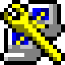 It’s 32 × 32 pixels, and uses a limited palette of primary colours and shades of grey. That’s because I started the project in the mid-1990s, when non-truecolour displays were very common. There was a fixed 16-colour palette recommended for use in icons, consisting of the obvious primary and secondary colours and dim versions of them, plus a couple of spare shades of grey. That way all the icons in the entire GUI could reuse the same 16 palette entries and not run the display out of colours. So this icon is drawn using that palette.